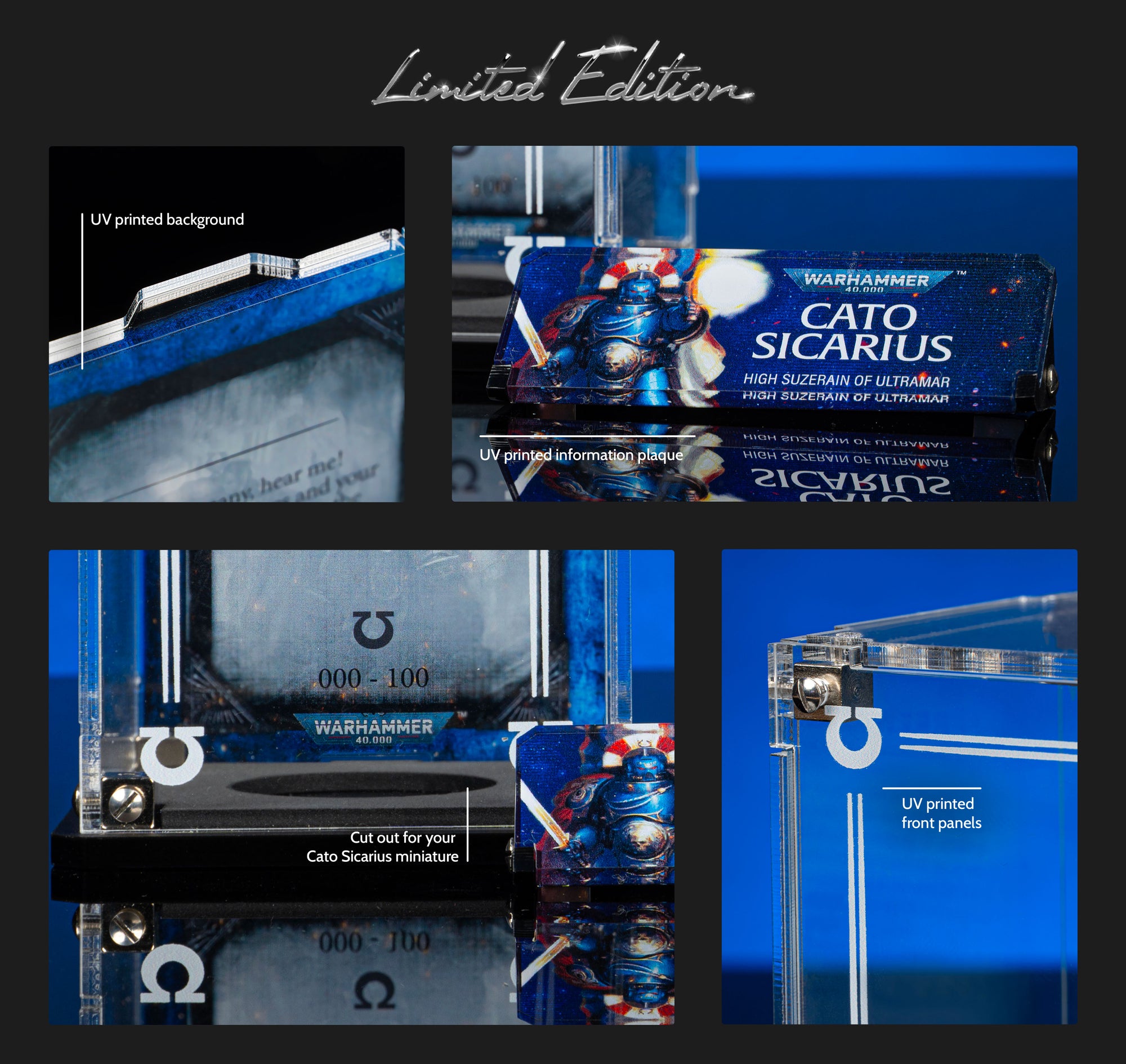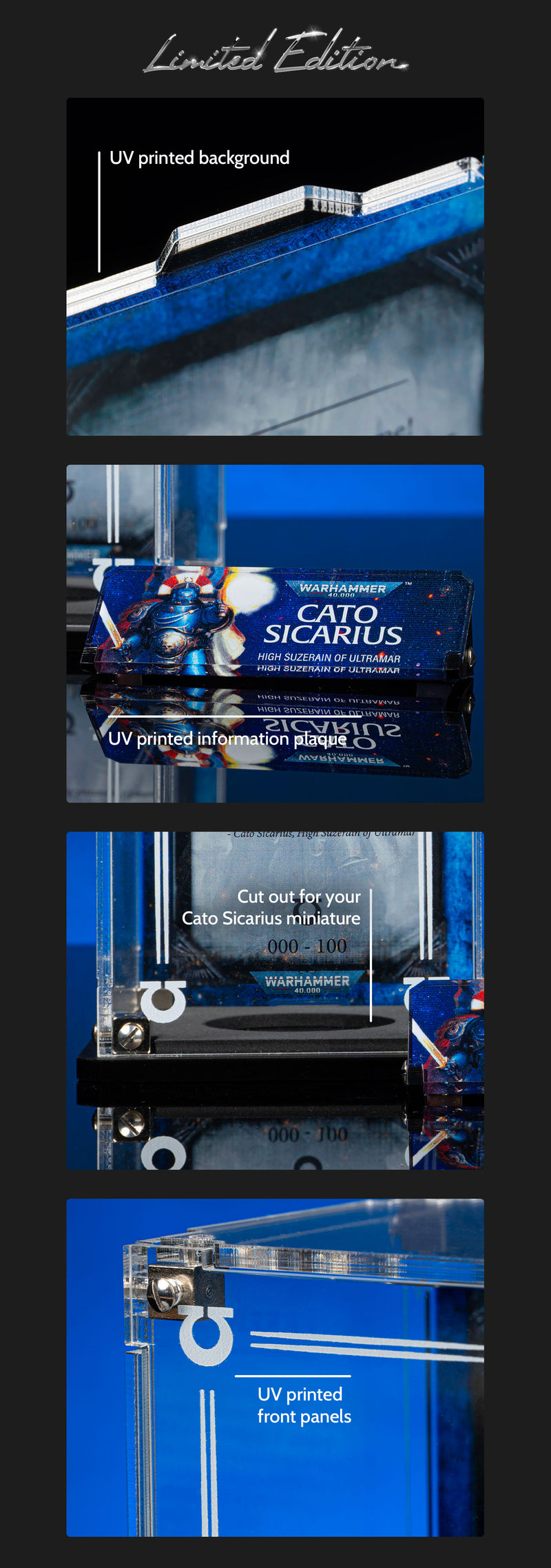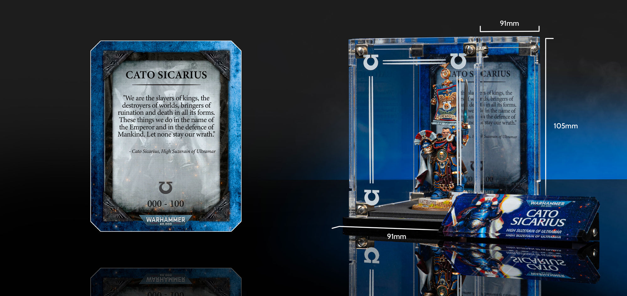 Designed exclusively for Cato Sicarius, our Limited Edition display case features Officially Licensed Warhammer 40,000 back panel artwork and a printed front panel that frames your Ultramarine. A dedicated name plaque completes the Cato Sicarius display, and your individually-issued Limited Edition number is printed directly onto the background.