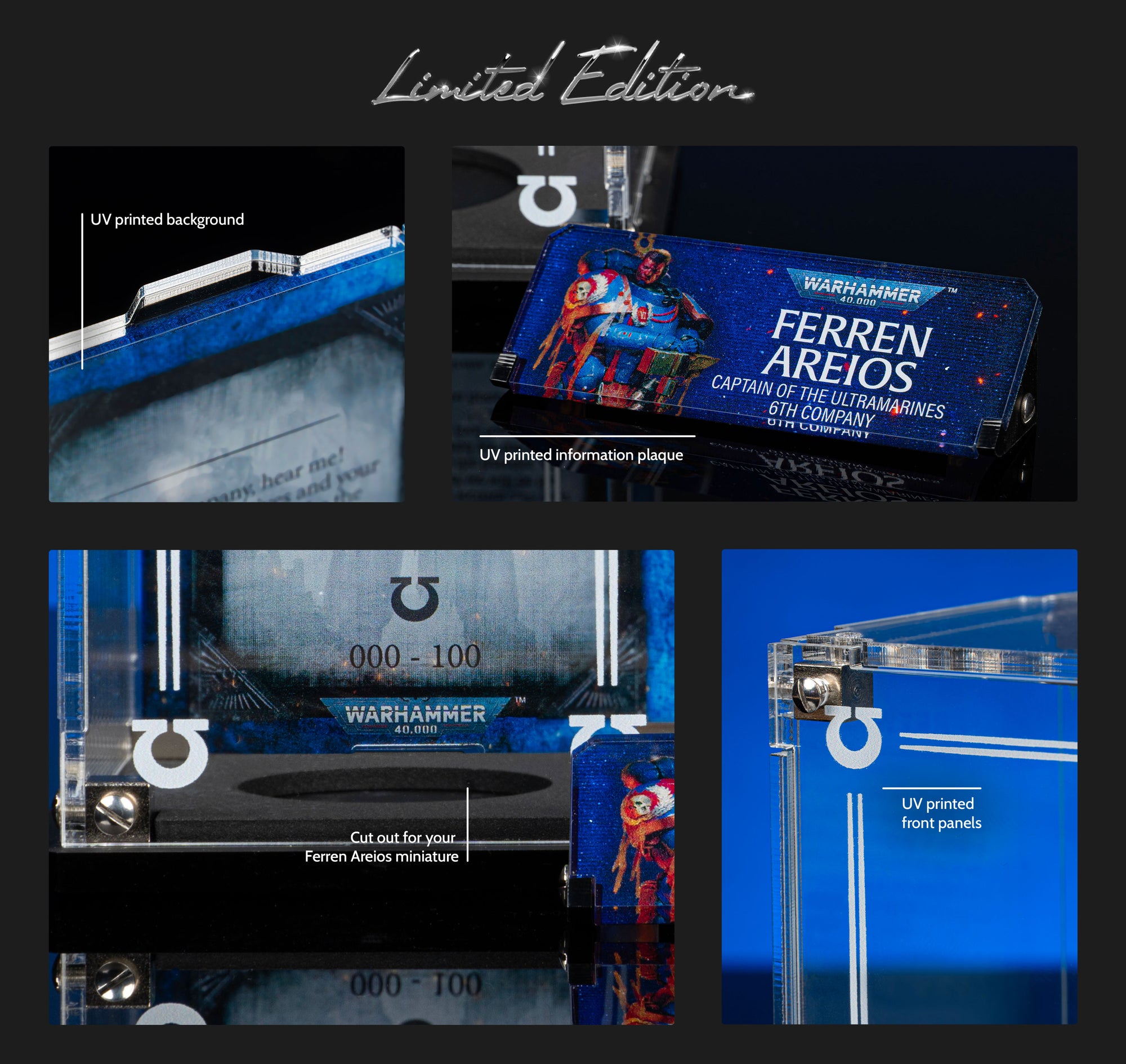 Designed exclusively for Ferren Areios, our Limited Edition display case features Officially Licensed Warhammer 40,000 back panel artwork and a printed front panel that frames your Ultramarine. A dedicated name plaque completes the Ferren Areios display, and your individually-issued Limited Edition number is printed directly onto the background.