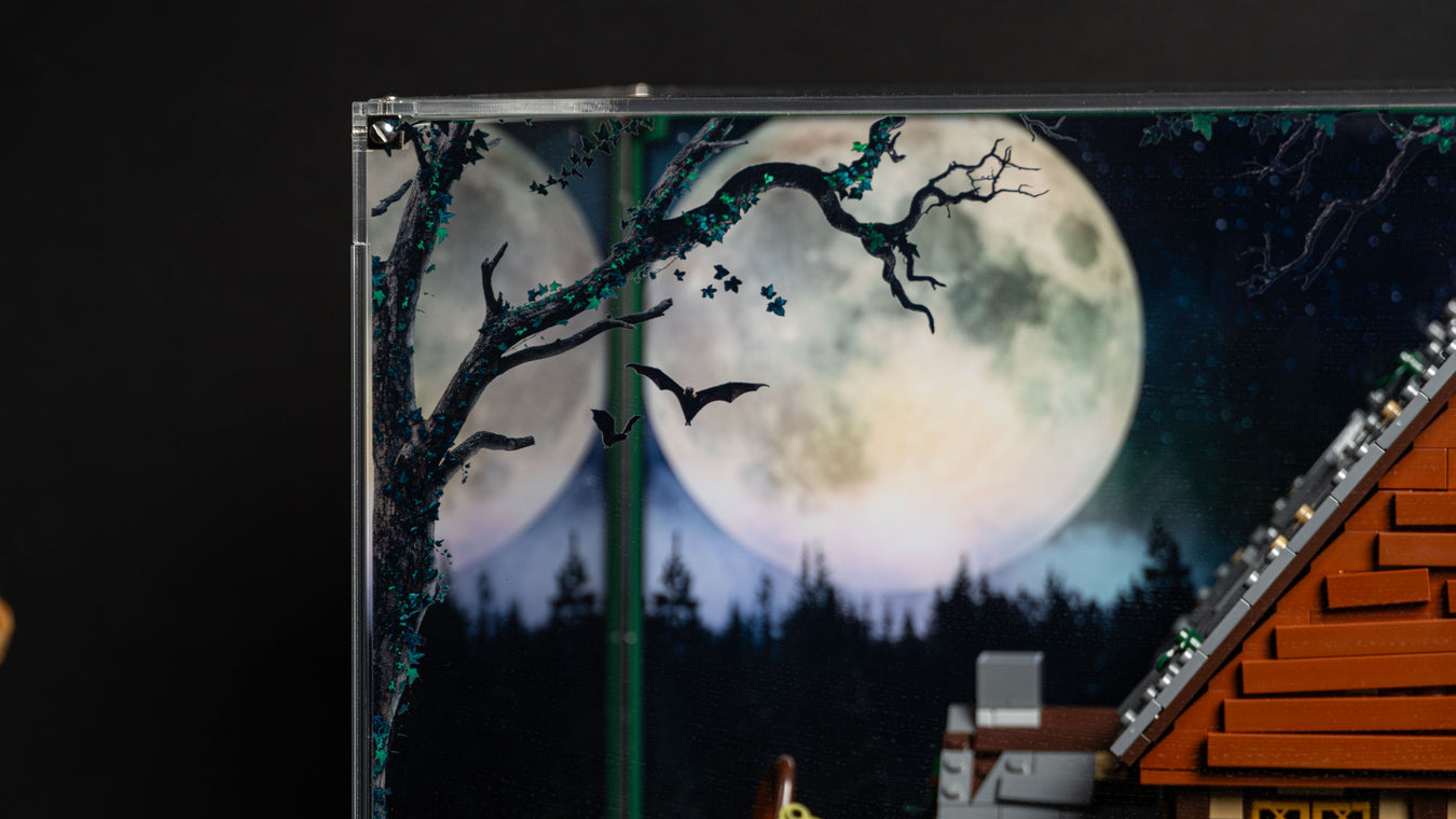 Create your spellbinding display for the LEGO® Ideas Hocus Pocus Sanderson Sisters' Cottage set with our range of display cases. Our Premium Printed display case features an eerie background and base print which creates a spellbinding and immersive display for your build.