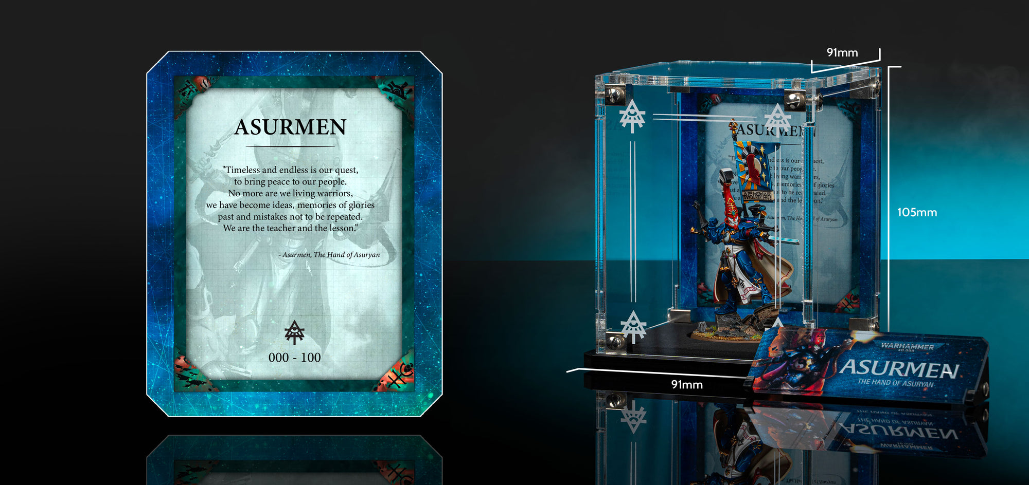 Designed exclusively for Asurmen, our Limited Edition display case features Officially Licensed Warhammer 40,000 back panel artwork and a printed front panel that frames your Aeldari miniature. A dedicated name plaque completes the Asurmen display, and your individually-issued Limited Edition number is printed directly onto the background.