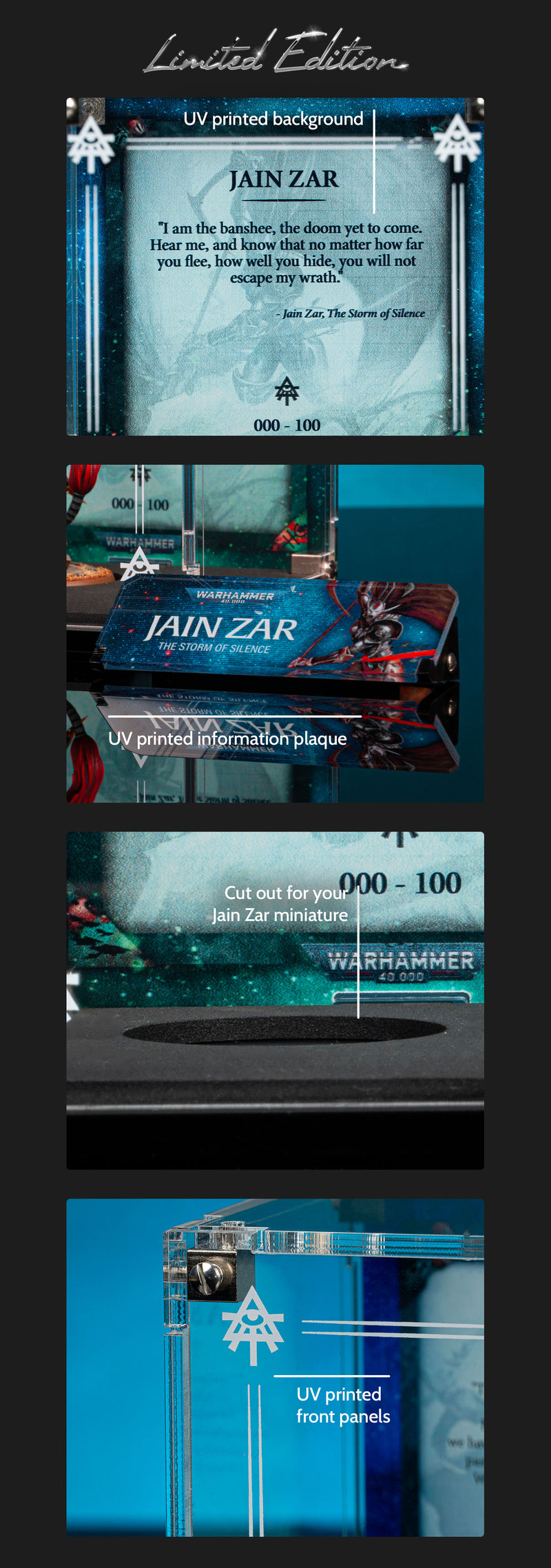 Designed exclusively for Jain Zar, our Limited Edition display case features Officially Licensed Warhammer 40,000 back panel artwork and a printed front panel that frames your Aeldari miniature. A dedicated name plaque completes the Jain Zar display, and your individually-issued Limited Edition number is printed directly onto the background.