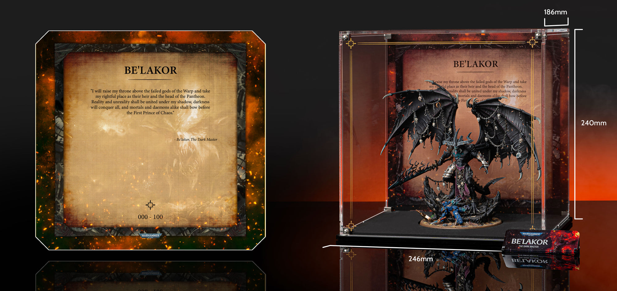 Designed exclusively for the Be’lakor, the Dark Master miniature, our Limited Edition display case features Officially Licensed Warhammer 40,000 back panel artwork and a printed front panel that immerses your miniature. A dedicated name plaque completes the display, and your individually-issued Limited Edition number is printed directly onto the background.
