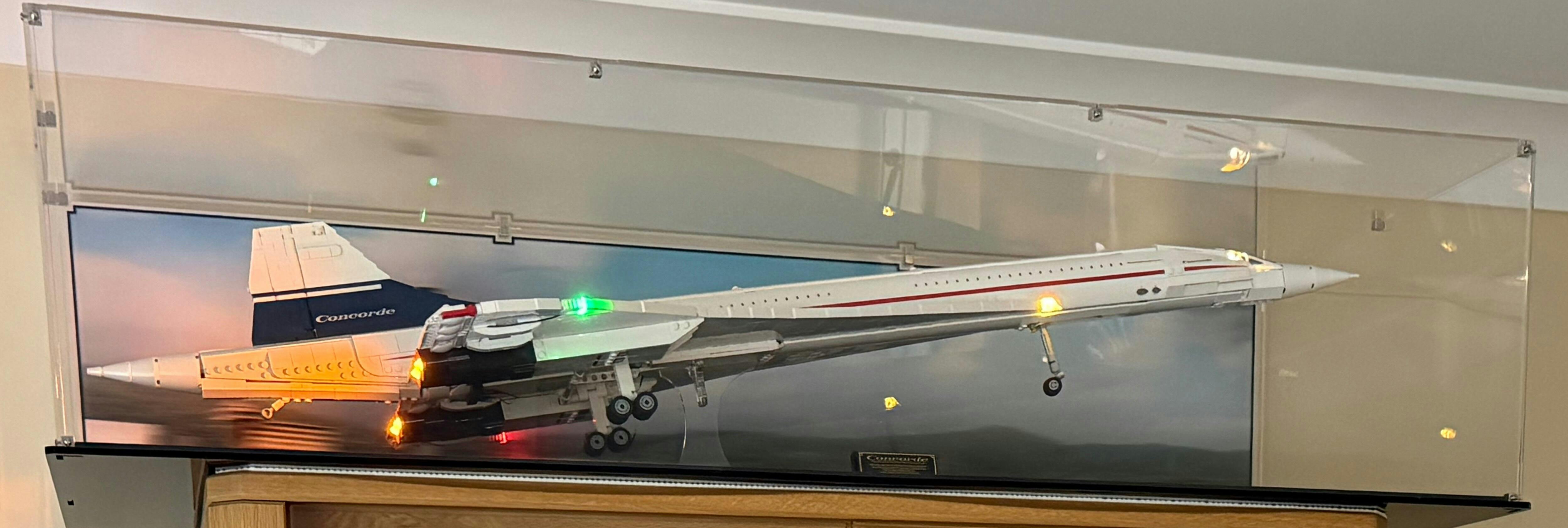 Showcase, protect and enhance your LEGO® Icons: Concorde set with our bespoke display cases and UV printed backgrounds.