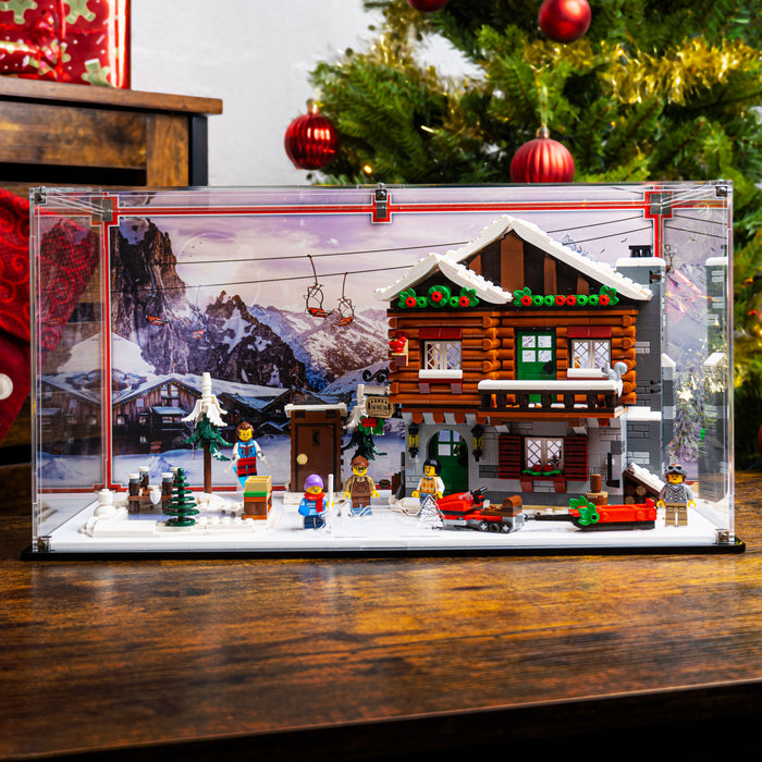 Create your dream display for the LEGO® Alpine Lodge set with our bespoke display case. Our display case has been specifically designed for the set and is crafted from premium Acrylic. The case has been built to keep your set 100% dust free and protected. An array of embedded studs hold both your set and Minifigures securely in place. Our included informational plaque sits in front of your build and showcases the set number and piece count. Our UV printed background design transports your set to a winter wonderland at the foot of a busy ski slope.