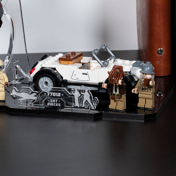 Showcase and hold your LEGO® Indiana Jones™ Fighter Plane Chase set at a dynamic flying position with our bespoke display stand. Crafted from premium Acrylic, our stand has been specifically designed for this set. Our included add-on piece sits at the front of the stand and features embedded studs to hold your Indiana Jones Minifigures in place below the plane. The car is held securely via cut-outs in the base piece. The included clear informational plaque slots neatly into the base and showcases the set number and piece count.