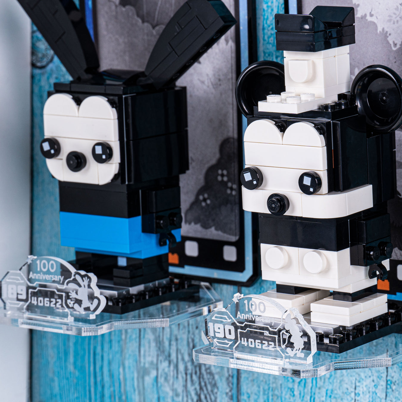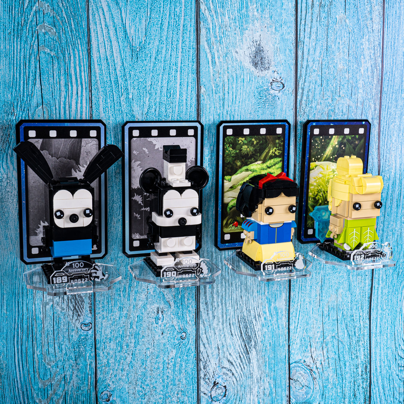 Stand your Oswald, Mickey, Snow White and Tinkerbell Brickhedz in front of a Disney 100 inspired background design with our custom wall mounted display stands.