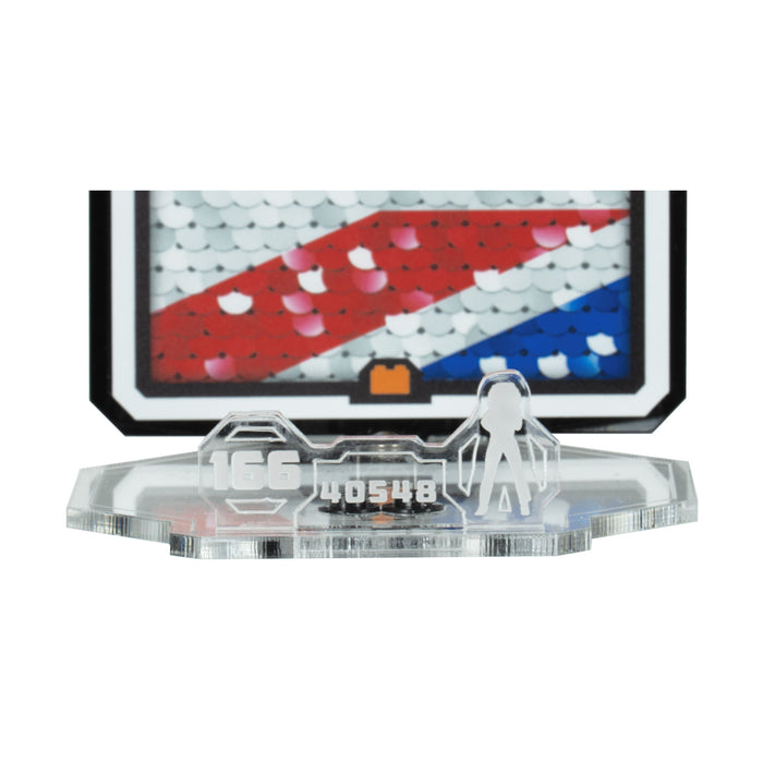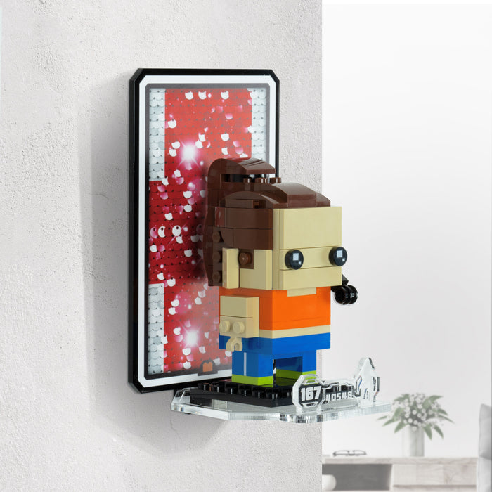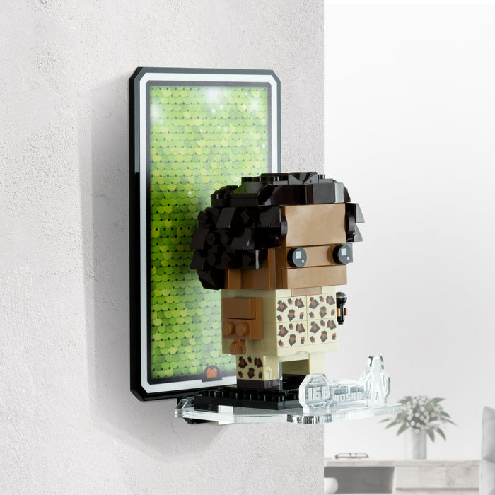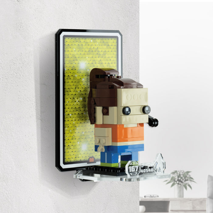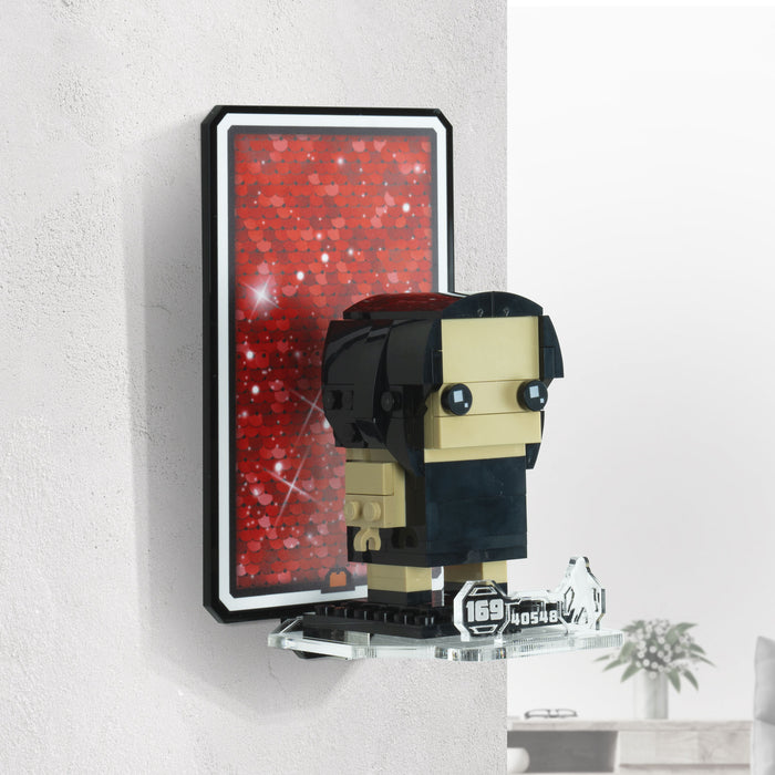 • Our wall mounted display stands features a 3mm clear baseplate with embedded studs to keep your Brickheadz secure and in place, as well as a cut out section for the included unique information plaque, featuring etched icons and details from the LEGO® Brickheadz set.