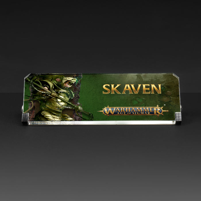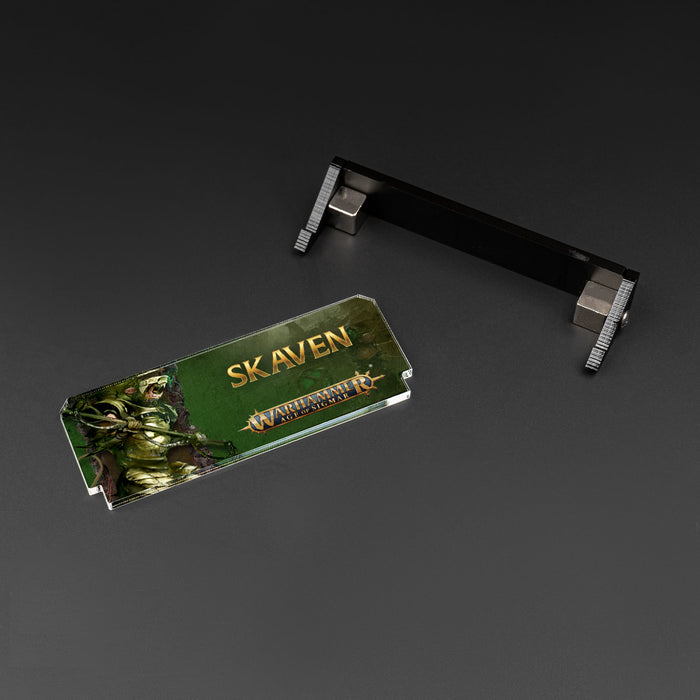 Enhance your Children of the Horned Rat display with an exclusive Skaven name plaque. Crafted using Officially Licensed artwork and premium acrylic, this easy-to-assemble plaque effortlessly enhances your Chaos display.
