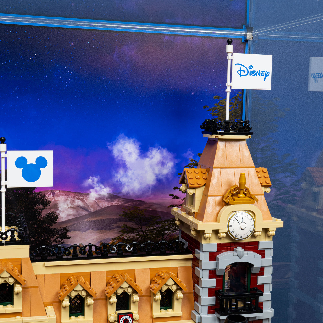 “I wanted to recreate the magical atmosphere of being in a Disney park with this background design. A lot of inspiration was taken from the real train station at Disney World in Orlando with the forest location and water tower placement. With the fireworks display at dusk being such an iconic part of the Disney experience, I knew they had to feature within the background. I also used a similar design and colour palette to our Disney Castle display case background allowing you to create a cohesive, side by side display.”