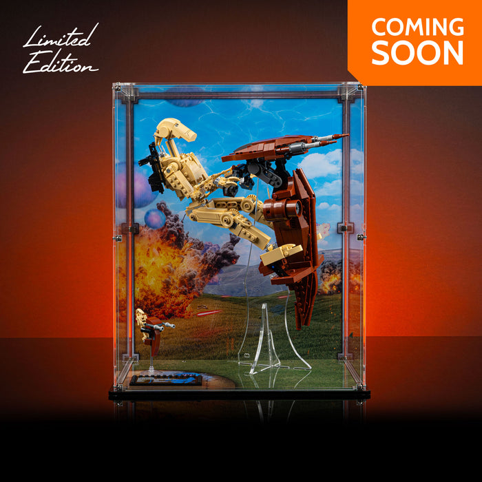 Our Limited Edition display case for the LEGO Star Wars: Battle Droid with STAP set immerses your B1-series Battle Droid amidst a battle scene aboard it’s classic light transport. Pay homage to the epic battles of the prequel trilogy by pitting your set in the action.