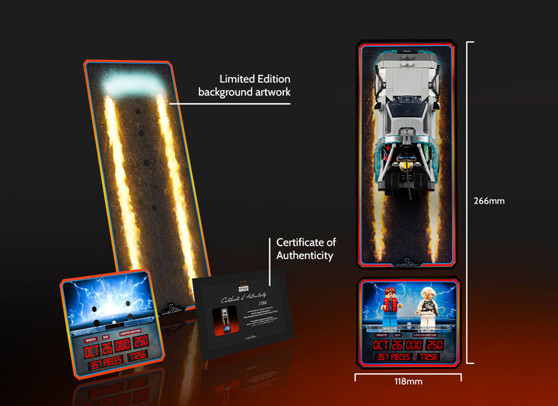 Mounted beneath the build is a Limited Edition UV-printed minifigure plaque and stand, detailing the set number, piece count, and individual Limited Edition issue number, which ensures each display is a true collector’s item. Precision-made from premium materials, this stand offers a striking, space-saving way to exhibit your Time Machine.