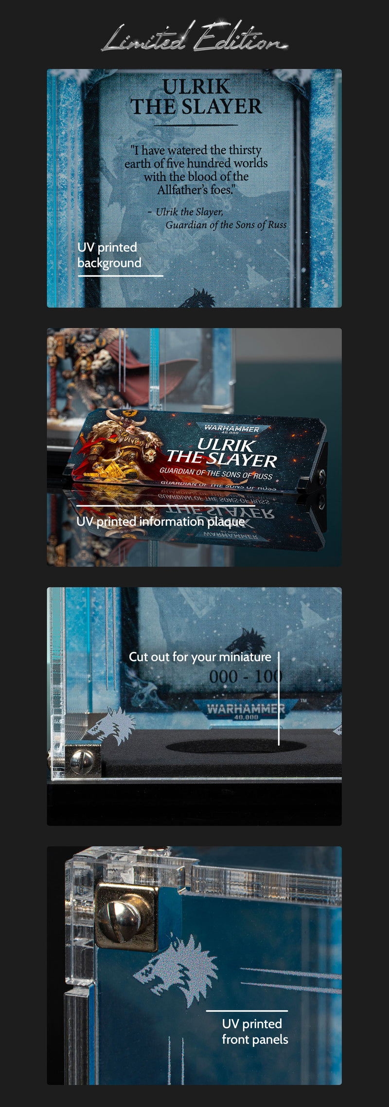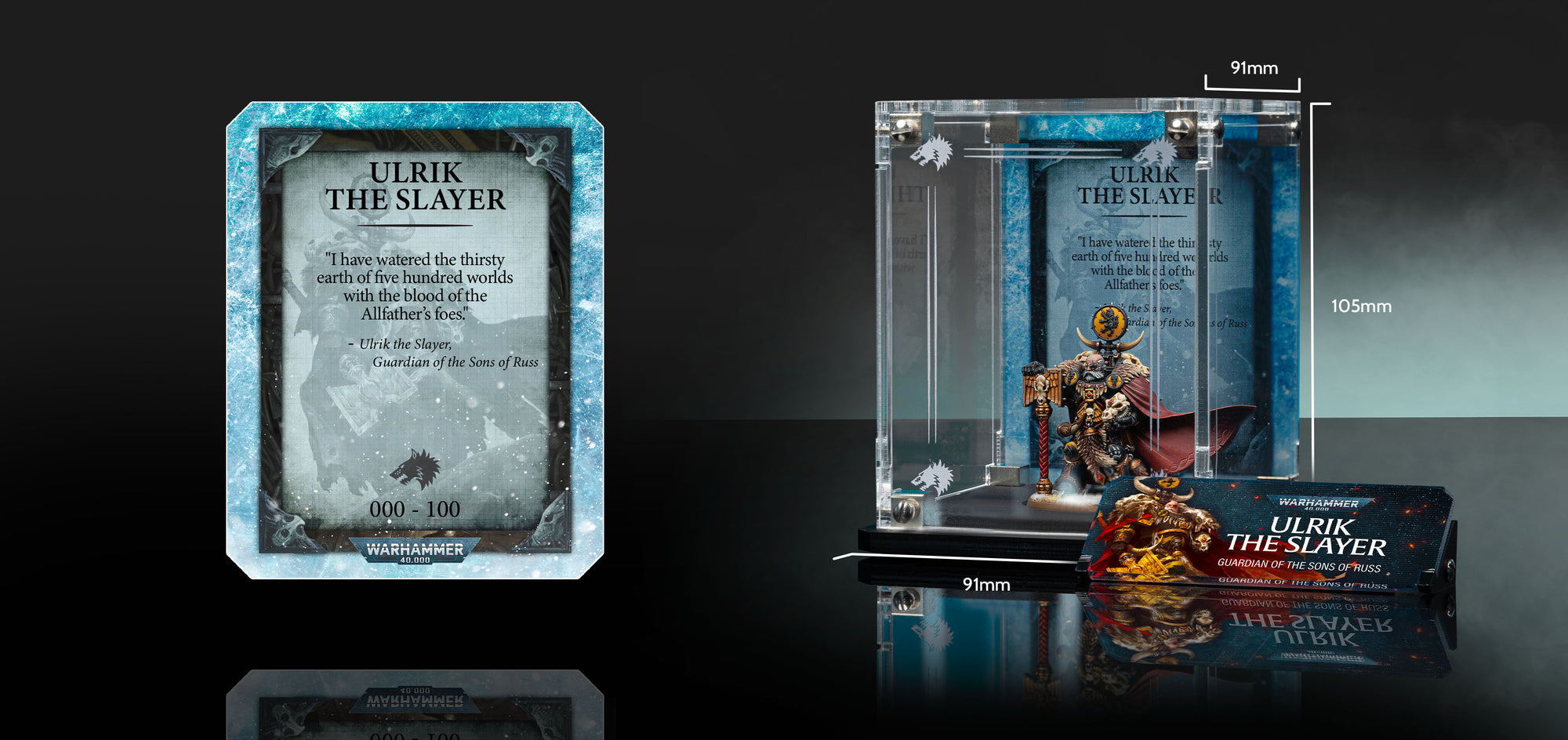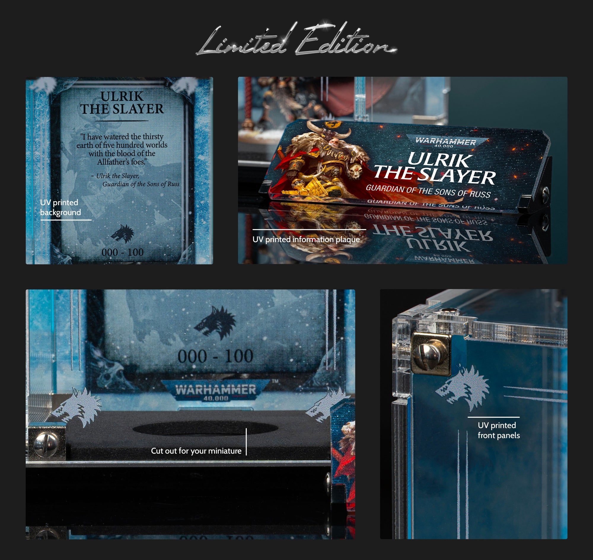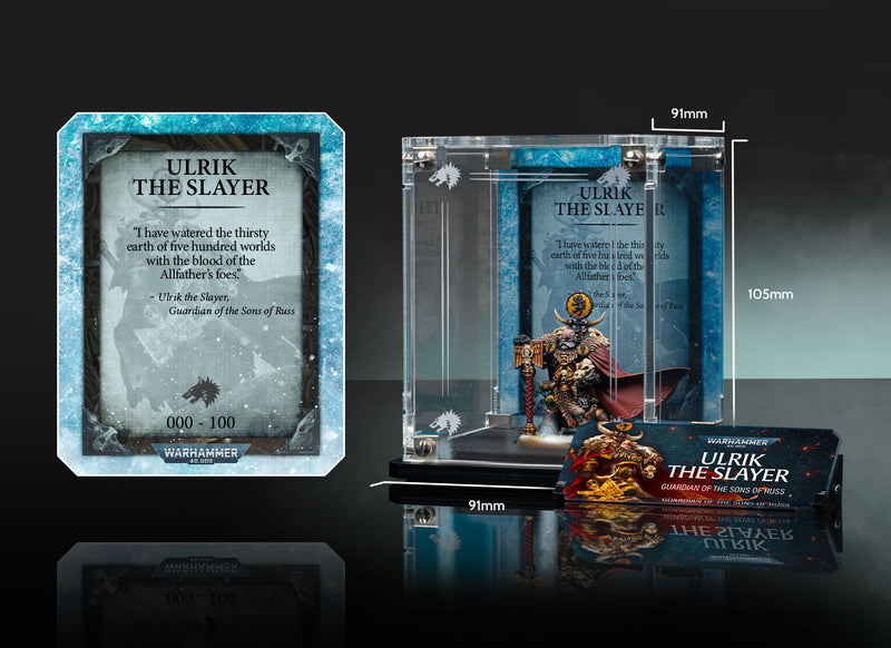 Crafted exclusively for Ulrik the Slayer, our Limited Edition display case features Officially Licensed Warhammer 40,000 back panel artwork and a printed front panel that frames the inspiring leader of your Space Wolves army. A dedicated name plaque completes the Ulrik display, and your individually-issued Limited Edition number is printed directly onto the background.